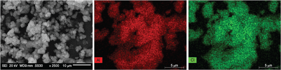 From the X-ray photoelectron (XP) spectrum (Fig. S8, Supplementary Material), the presence of chlorine is observed in MIL-53-Fum-Cl. The peak at ~200 eV binding energy accounts for an organic chlorine.[26] Thus, there has been formation of a C–Cl bond during the reaction. This chlorine atom is obviously bonded to the second olefinic carbon atom that was observed in the ssNMR analysis (signal b in Fig. 4a). Peaks at 73.7 and 74.5 eV binding energy are due to Al–O and Al–OH respectively.[27] Scanning electron microscopy (SEM) energy-dispersive X-ray spectroscopy (EDX) elemental mapping (Fig. 5) further shows the presence of chlorine homogenously distributed over the whole MIL-53-Fum-Cl sample range. The molar atomic aluminium to chlorine (Al : Cl) ratio of ~1 : 0.7 (from EDX, details in Supplementary Material) is different from the expected 1:1 ratio for an ideal MIL-53-type MOF (ideal formula: [Al(OH)(linker)]). This is however in agreement with the occurrence of ~0.4 missing linker per formula unit of the synthesized MIL-53-Fum-Cl.